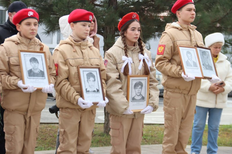 Особой частью мероприятия стала «колонна памяти»: юнармейцы держали в руках портреты не вернувшихся героев — жителей Темрюкского района.
