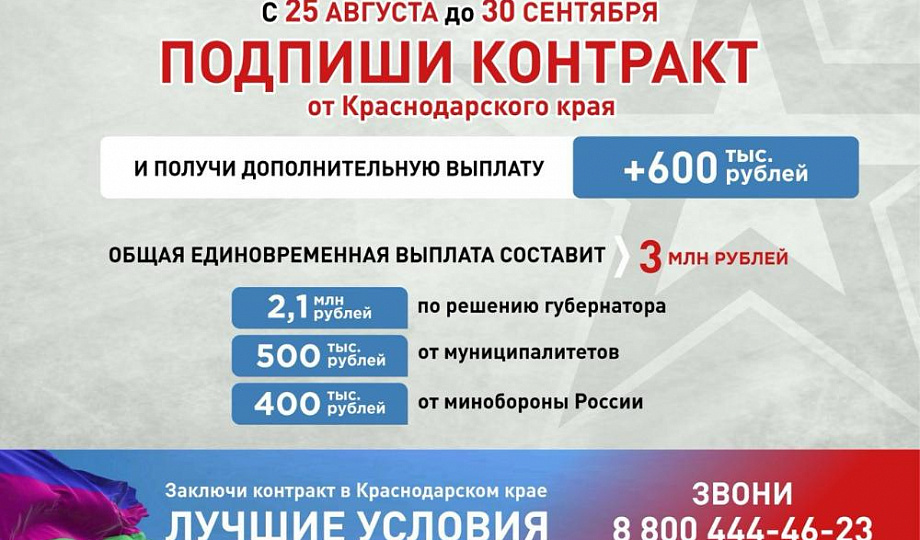 В итоге военнослужащие – участники специальной военной операции при подписании контракта в этот период от любого из районов Краснодарского края – получат в совокупности 3 млн рублей. Такая сумма – при подписании контракта с Министерством обороны РФ с 25 августа до 30 сентября 2025 г. включительно.