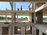 На объекте ведутся работы по армированию и бетонированию плиты перекрытия третьего этажа. Параллельно осуществляется устройство наружных стен из газоблока первого этажа