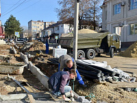 Параллельно проводится ремонт тротуара с установкой бордюров на участке улицы Степана Разина от улицы Ленина до улицы Октябрьской