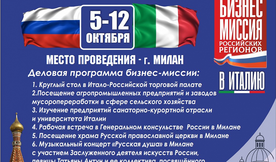 С 5 по 12 октября 2025 года пройдет агропромышленная бизнес-миссия регионов России в Италию.