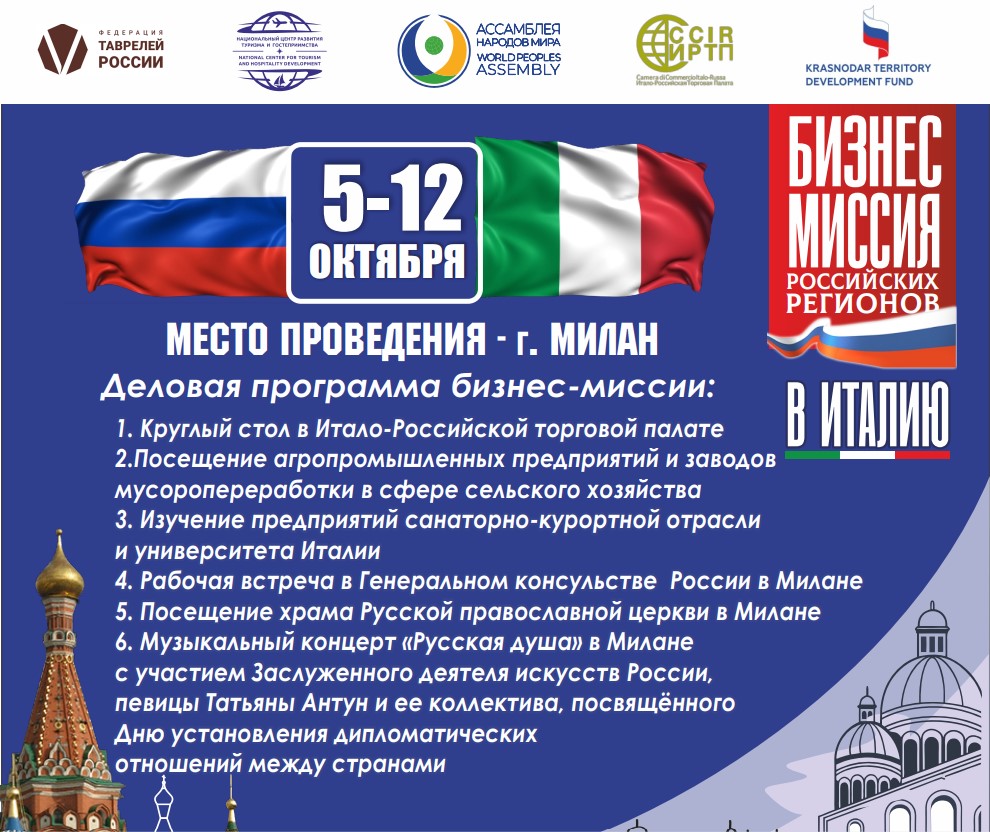 Организатором бизнес-миссии выступили Фонд развития Краснодарского края и АНО «Национальный центр развития туризма и гостеприимства» при поддержке Почетного Генерального консула Италии в Краснодаре Пьерпаоло Лодиджиани, Итало-Российской торговой палаты, Ассамблеи народов мира и Федерации Таврелей России.