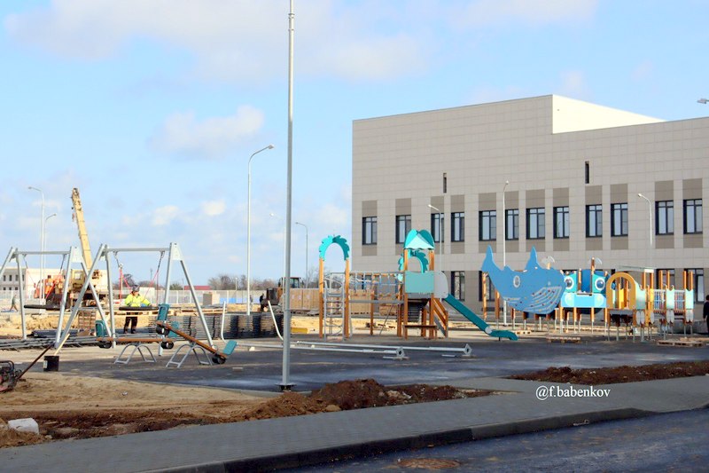 Подрядчик уложил плитку в пешеходных зонах и асфальт в зонах проезда транспорта. Проводится монтаж игрового оборудования, после установки которого будет уложено резиновое покрытие.