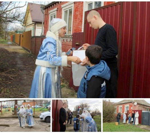 Егор обрадовался конструктору, Никита – машинке на пульте управления, еще один Егор получил световой стол для рисования песком. Ребята и их родители очень обрадовались гостям, плясали с ними у украшенной елки, подержали в руках посох Деда Мороза, попросили у него снега. Их соседи с удивлением и улыбкой смотрели на шествующих по улицам главных героев новогодних праздников.