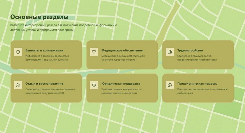 Проект объединяет информацию о выплатах, медицинском обеспечении, трудоустройстве, отдыхе и восстановлении, юридической и психологической помощи в едином удобном формате.