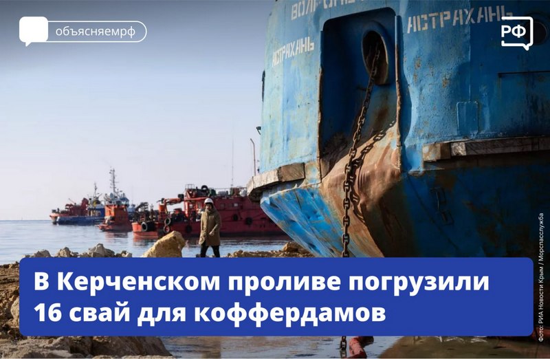 Рядом с фрагментами уже погрузили 16 из 48 свай, которые нужны для установки коффердамов. Эти металлоконструкции сейчас собирают в доке порта Новороссийск. Работы идут по графику.