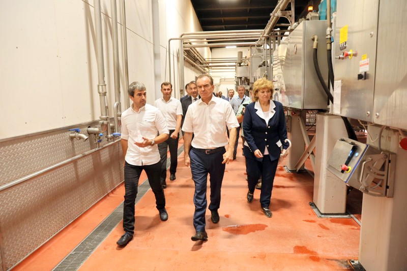 Вениамин Кондратьев посетил центр энологии «Шато Тамань», где осмотрел линию переработки винограда, мощностью 2,2 тыс. тон за смену. Здесь также проводят экскурсии, способствующие популяризации винного туризма.