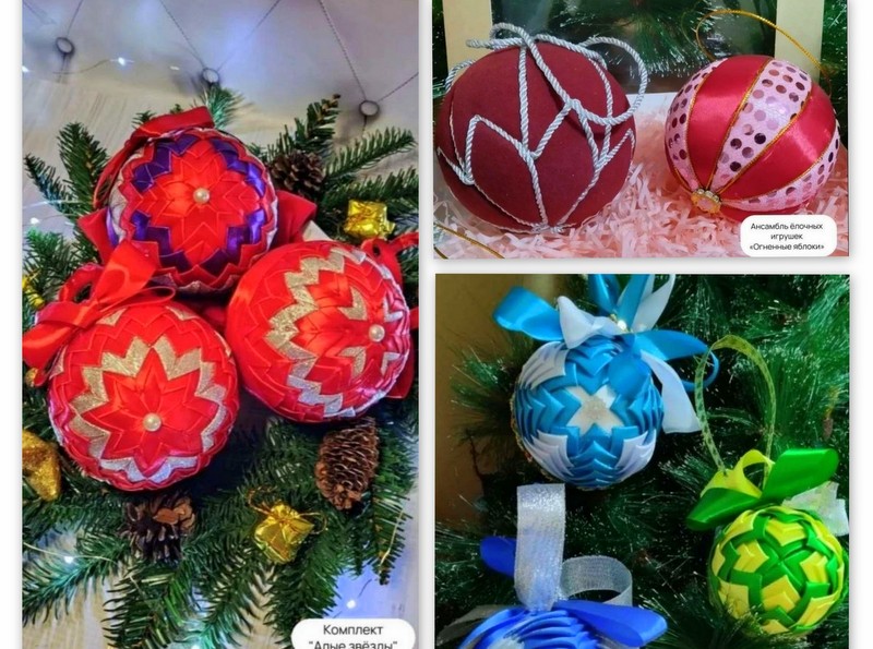 Участницы клубно-любительского объединения «Созидание» - Ульяна Дымченко, Нина Карцева и руководитель Оксана Суржик представили на суд жюри три серии изысканных новогодних игрушек, выполненных в стиле канзаши: «Праздник, застывший в атласе», «Огненные яблоки» и «Алые звезды».