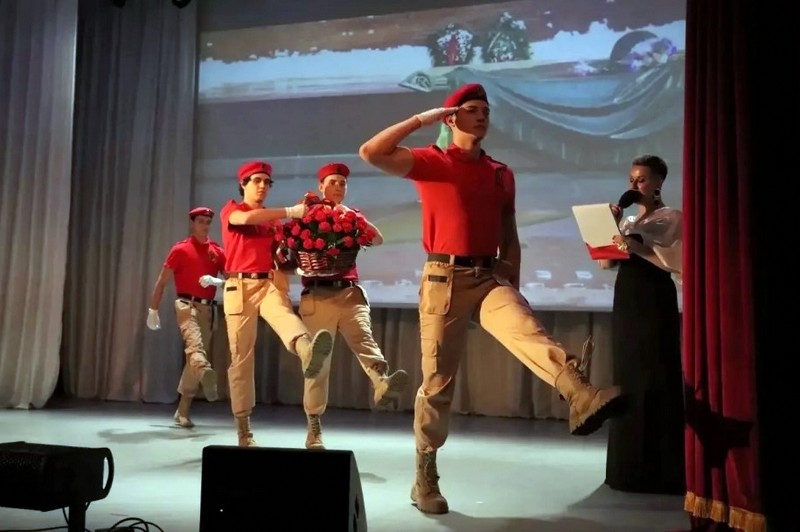 В рамках торжественного мероприятия, проходившего в районном Доме культуры, юнармейцы вынесли цветочную корзину для возложения у Мемориала.
