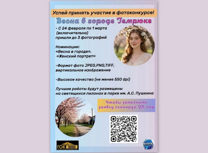 С 24 февраля по 1 марта пройдет конкурс фотографий «Весна в городе Темрюке». На конкурс принимаются фотографии в двух номинациях «Весна в городе» и «Женский портрет». К участию приглашаются все желающие.