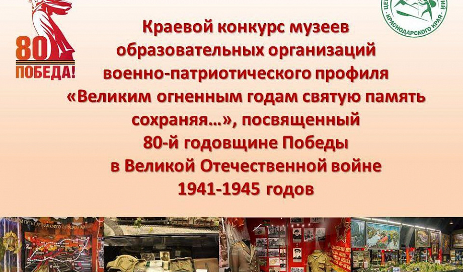 С 27 января по 12 сентября «Центр туризма и экскурсий» проводит краевой конкурс музеев образовательных организаций военно-патриотического профиля «Великим огненным годам святую память сохраняя…», посвященный 80-й годовщине Победы в Великой Отечественной войне 1941-1945 годов.