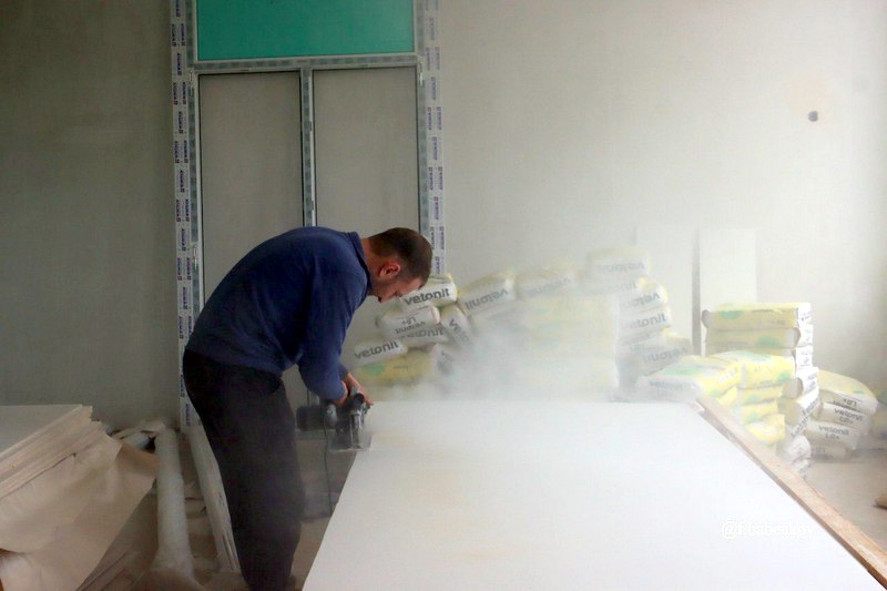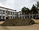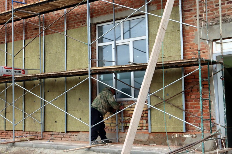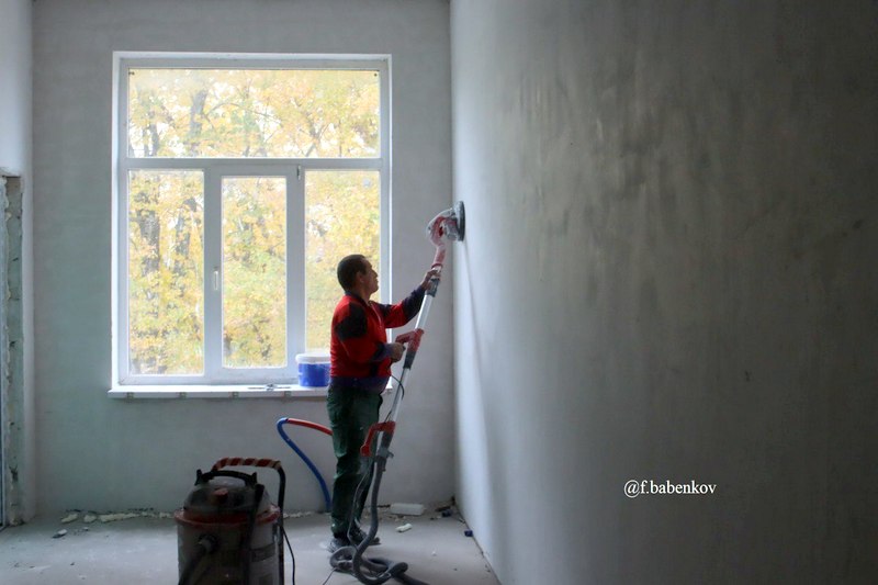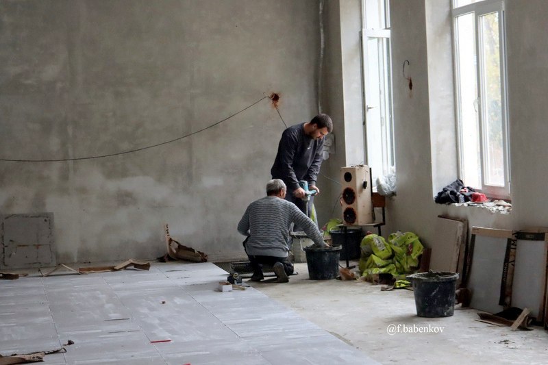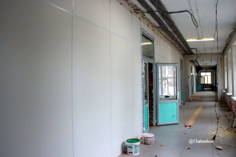 На первом этаже ведутся работы по укладке плитки в коридорах и на лестничных маршах. На обоих этажах выполняется укладка плитки в санузлах. Параллельно проводится благоустройство двора и работы по ремонту фасада здания.