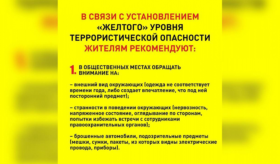 на территории муниципального образования действует высокий («желтый») уровень террористической опасности