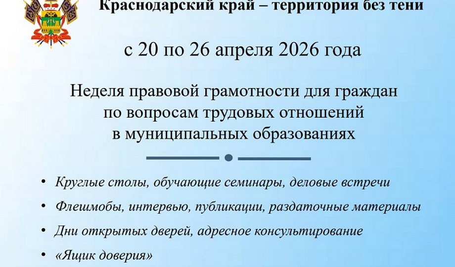 Начиная с 2022 года ежегодно, во всех муниципальных образованиях Краснодарского края весной и осенью проводятся мероприятия недели правовой грамотности «Краснодарский край – территория без тени».
