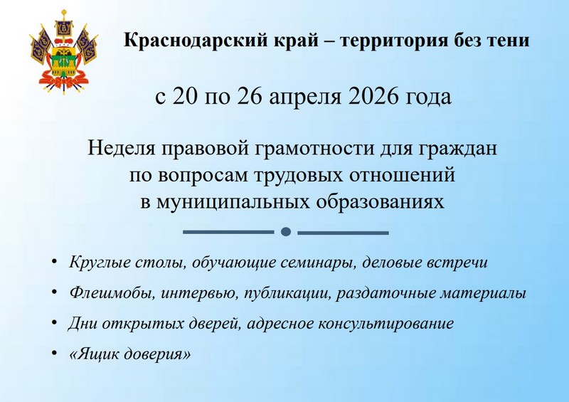 Начиная с 2022 года ежегодно, во всех муниципальных образованиях Краснодарского края весной и осенью проводятся мероприятия недели правовой грамотности «Краснодарский край – территория без тени».
