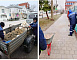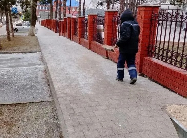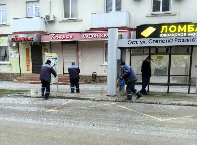 С раннего утра специалисты дорожных и коммунальных служб города Темрюка проводят обработку проезжих частей и тротуаров специальной смесью.