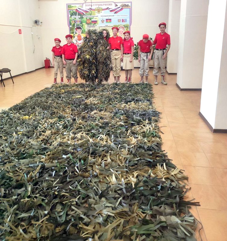 Юнармейцы плетут маскировочные сети — крайне необходимый элемент экипировки.