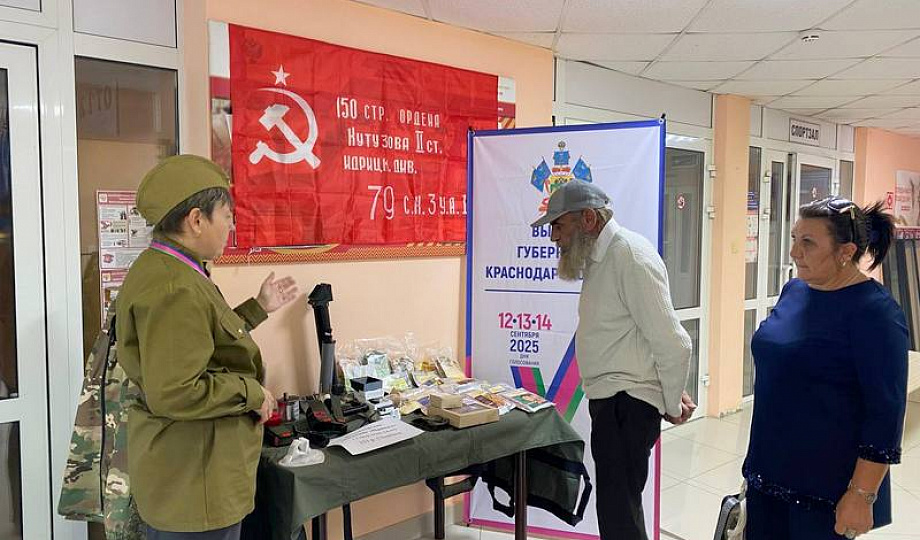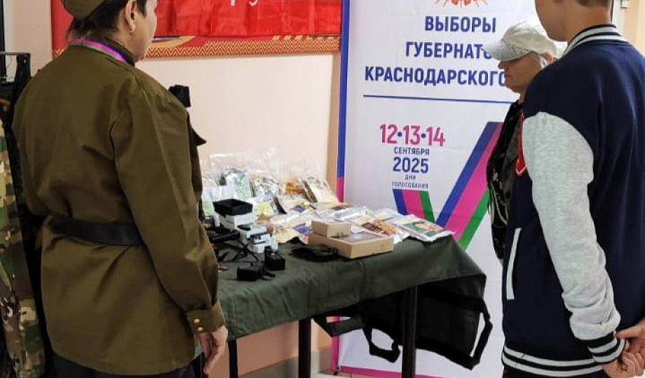 Члены избирательной комиссии во главе с председателем Ириной Жирновой облачились в стилизованную военную форму. На участке организовали выставку, где избирателям рассказывают и показывают, что изготавливают и передают волонтеры для бойцов СВО.