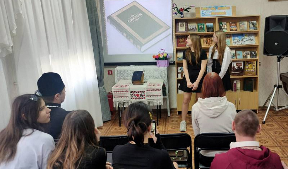Наверное, каждый испытывает невольный трепет, когда возьмет в руки старинную книгу, перелистает чуть пожелтевшие страницы, вдохнет ни с чем не сравнимый аромат старины. В этот день ребятам посчастливилось познакомиться с книжной выставкой, на которой была представлена всего лишь одна книга - Библия 1917 года издания. Эта книга была любезно предоставлена библиотеке прихожанкой храма Святого Благоверного князя Александра Невского города Темрюка из личной коллекции.