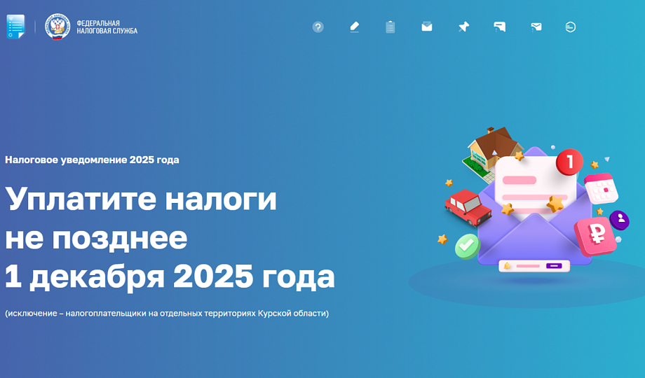 Оплатить исчисленные в уведомлениях налог на имущество, транспортный и земельный налоги необходимо не позднее 1 декабря 2025 года. Исключение – налогоплательщики на отдельных территориях Курской области, для которых указанный срок уплаты продлен на 12 месяцев постановлениями Правительства РФ от 04.09.2024 № 1222, 07.12.2024 № 1735.