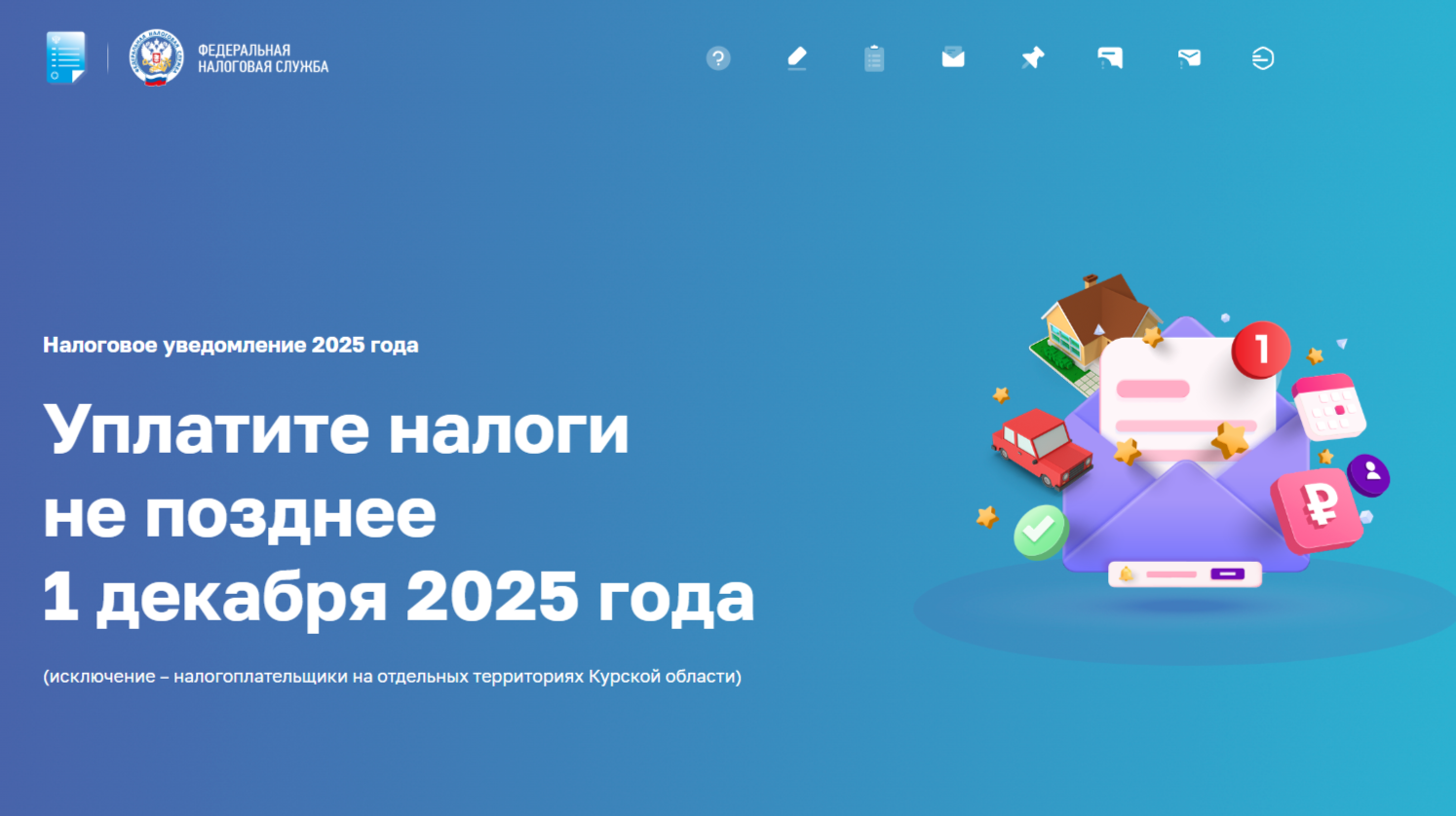 Оплатить исчисленные в уведомлениях налог на имущество, транспортный и земельный налоги необходимо не позднее 1 декабря 2025 года. Исключение – налогоплательщики на отдельных территориях Курской области, для которых указанный срок уплаты продлен на 12 месяцев постановлениями Правительства РФ от 04.09.2024 № 1222, 07.12.2024 № 1735.