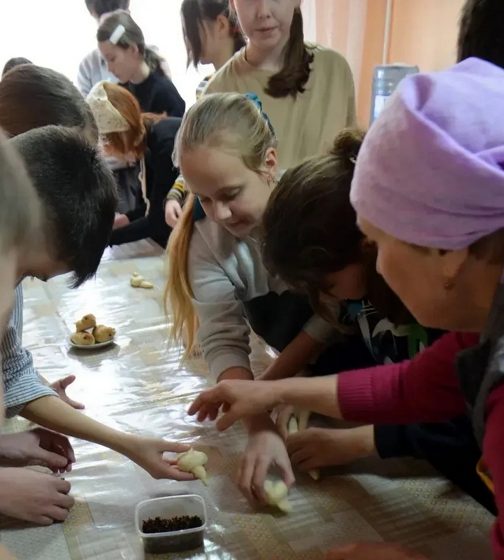 После беседы все прошли на кухню, где дети научились лепить и выпекать жаворонков.