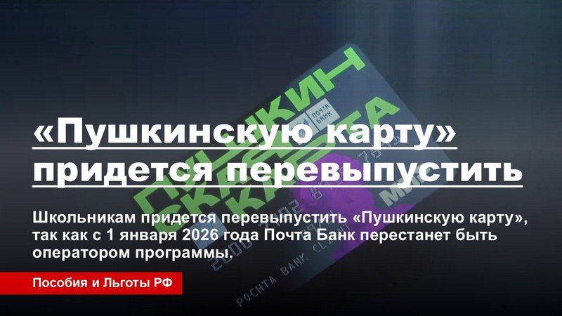 Школьникам придется перевыпустить «Пушкинскую карту», так как с 1 января 2026 года Почта Банк перестанет быть оператором программы.