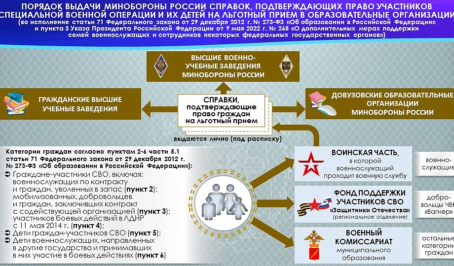 Оформление и выдача справки, подтверждающей право лиц, указанных в пунктах 2-6 части 5.1 статьи 71 Федерального закона от 29 декабря 2012 г. № 273-ФЗ «Об образовании в Российской Федерации", на прием на обучение в военных образовательных организациях высшего образования Министерства обороны Российской Федерации и в образовательных организациях высшего образования по программам бакалавриата, программам специалитета на места в пределах отдельной квоты, а также справки, подтверждающей право детей лиц, указанных в пункте 3 Указа Президента Российской Федерации от 9 мая 2022 г. № 268 «О дополнительных мерах поддержки семей военнослужащих и сотрудников некоторых федеральных государственных органов», на прием на обучение в образовательных организациях, указанных в части 6.1 статьи 86 Закона об образовании, по образовательным программам основного общего и среднего общего образования, интегрированным с дополнительными общеразвивающими программами, имеющими целью подготовку несовершеннолетних обучающихся к военной или иной государственной службе, в том числе к государственной службе российского казачества, по рекомендуемым образцам (прилагаются), осуществляются:
