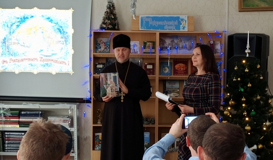 По старой русской традиции в первые дни праздника принято навещать близких и дарить подарки. Батюшка подарил библиотеке красиво оформленный справочный календарь Русской Православной Церкви на 2026 год, включающий речи и проповеди Святейшего Патриарха Московского и всея Руси Кирилла.