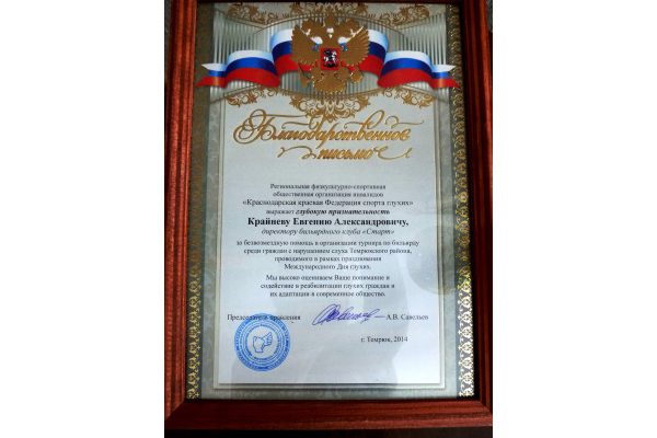 Председатель правления районной физкультурно-спортивной  организации инвалидов краевой федерации спорта глухих Александр Савельев передал коллективу бильярдного клуба благодарственное письмо его руководителю Евгению Крайневу. «Мы высоко ценим Ваши помощь и содействие в реабилитации глухих граждан и их адаптации в современном обществе», - говорится в письме.