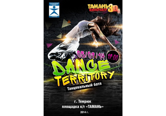 5 сентября, в 19 часов, в Темрюке, возле кинотеатра "ТАМАНЬ 3D" пройдёт первый городской фестиваль брейк-данса на приз главы города Темрюка. В батле под названием "DANGE TERRITORY" вас порадуют своим выступлением команды из Славянска-на-Кубани, Темрюка и Тимашёвска.