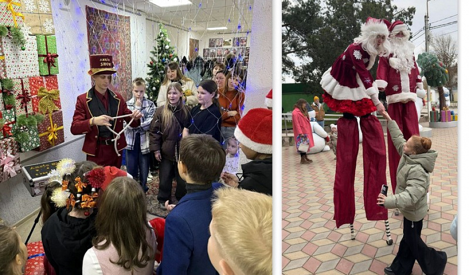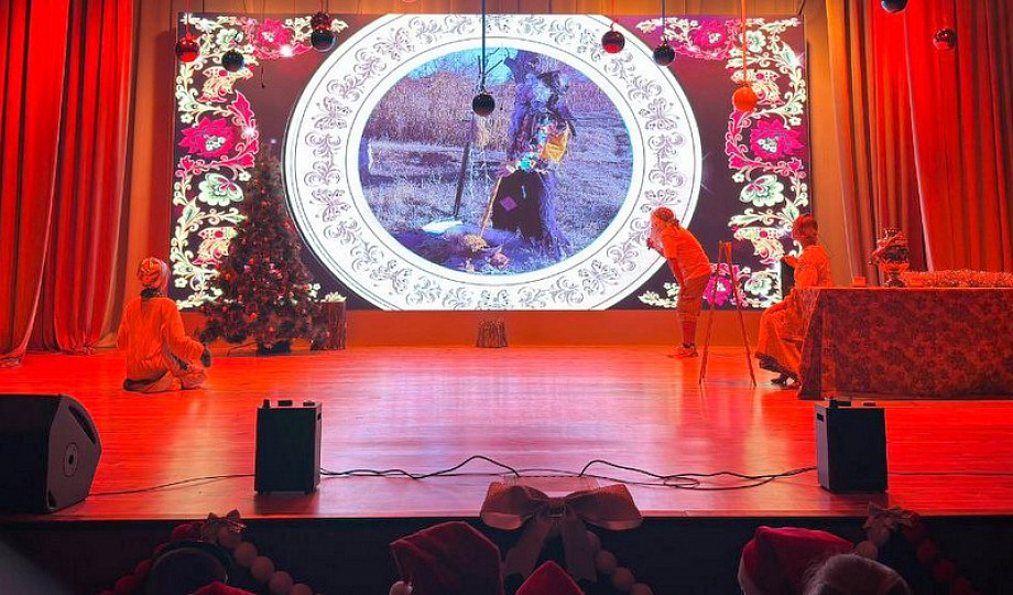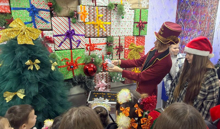 Уже на входе юных зрителей и их родителей встречали ходулисты в ярких костюмах Деда Мороза и Снегурочки, создавая праздничное настроение. В фойе гости Дома культуры могли наблюдать за выступлениями иллюзиониста. Дети участвовали в фокусах, узнавали секреты трюков и осваивали технику их выполнения.