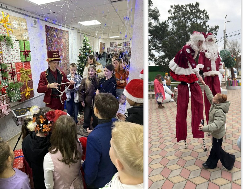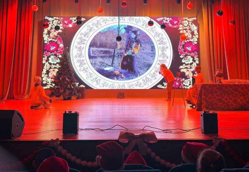 Уже на входе юных зрителей и их родителей встречали ходулисты в ярких костюмах Деда Мороза и Снегурочки, создавая праздничное настроение. В фойе гости Дома культуры могли наблюдать за выступлениями иллюзиониста. Дети участвовали в фокусах, узнавали секреты трюков и осваивали технику их выполнения.