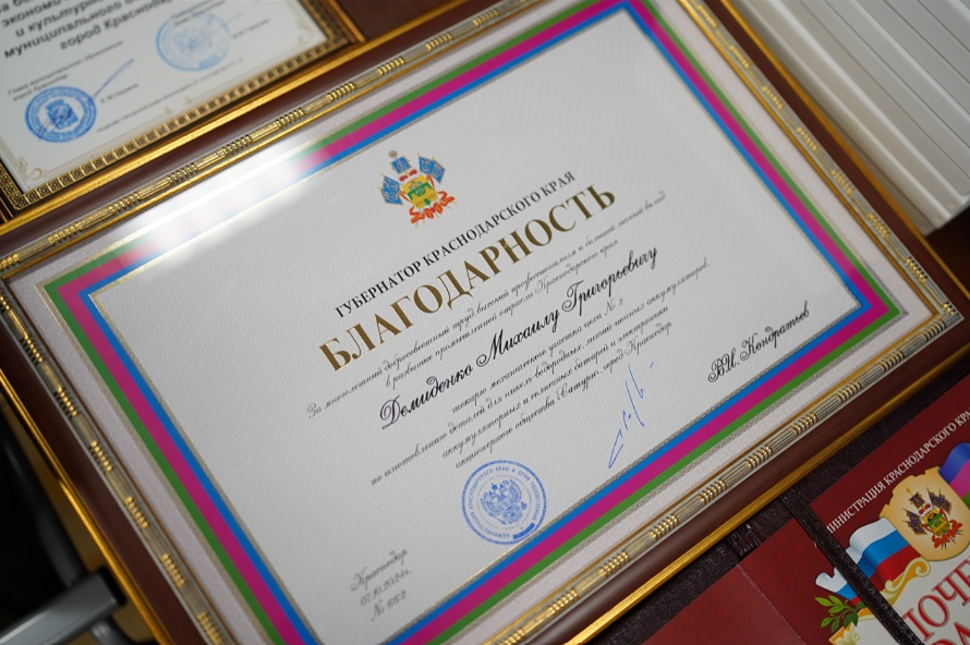 За многолетний добросовестный труд, высокий профессионализм и большой личный вклад в развитие промышленной отрасли Александр Руппель вручил благодарственные грамоты губернатора Кубани и почетные грамоты администрации Краснодарского края шести работникам завода, а также генеральному директору предприятия Олегу Планкевичу. Грамотами министерства промышленной политики края и администрации Краснодара наградили 29 специалистов производства.