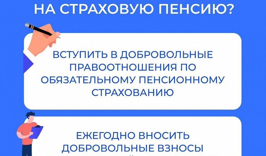 Для этого нужно вступить в добровольные отношения по пенсионному страхованию с Соцфондом. Благодаря цифровизации это удобнее всего сделать на Госуслугах vk.cc/cAFefa или в мобильном приложении «Мой налог» vk.cc/cAFevS. И далее направлять взносы.
