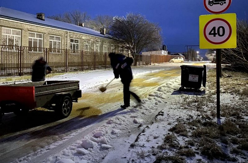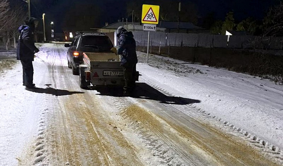 В Темрюкском районе продолжаются работы по обработке дорог, тротуаров и остановочных пунктов пескосоляной смесью