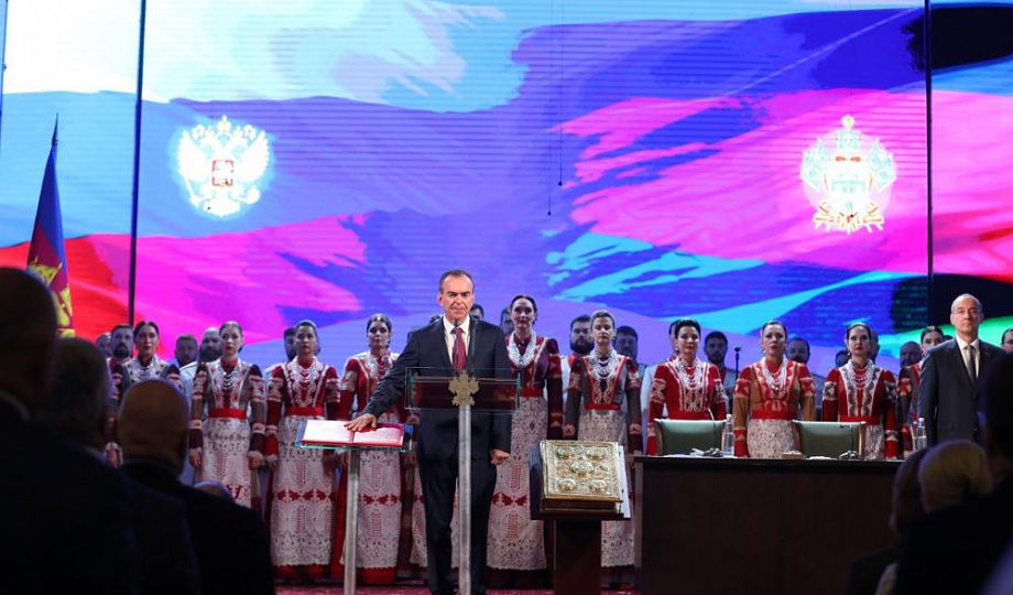 Избранный глава региона принес присягу на верность народу и Конституции Российской Федерации, Уставу Краснодарского края.