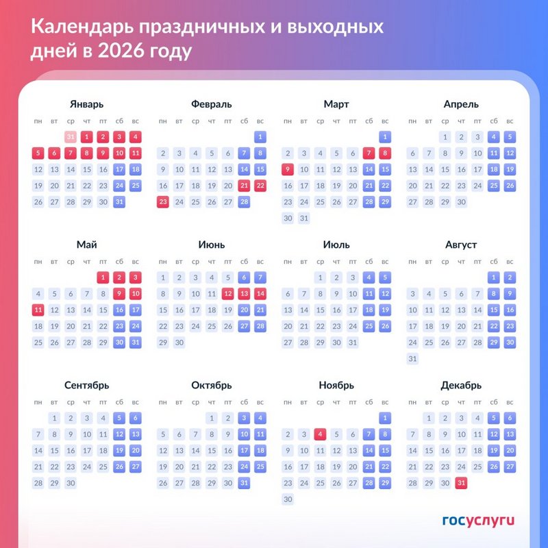 Утвержден график длинных выходных и праздников в 2026 году. Несколько праздничных дней выпадают на субботу и воскресенье. Поэтому выходные перенесли на будние дни. Например, 3 января — на пятницу 9 января (пятница), а 4 января — на четверг 31 декабря.