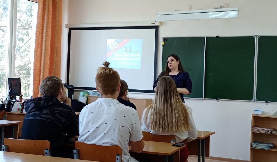 21 апреля в России отмечается День местного самоуправления. В этот день молодой депутат Фонталовского сельского поселения Темрюкский район Вера Жданова совместно с методистом по работе с молодежью Екатериной Торгашовой провели информационный урок с учащимися 10 класса МБОУ СОШ № 23 пос. Кучугуры. Ребят ознакомили с историей местного самоуправления в Российской Федерации.