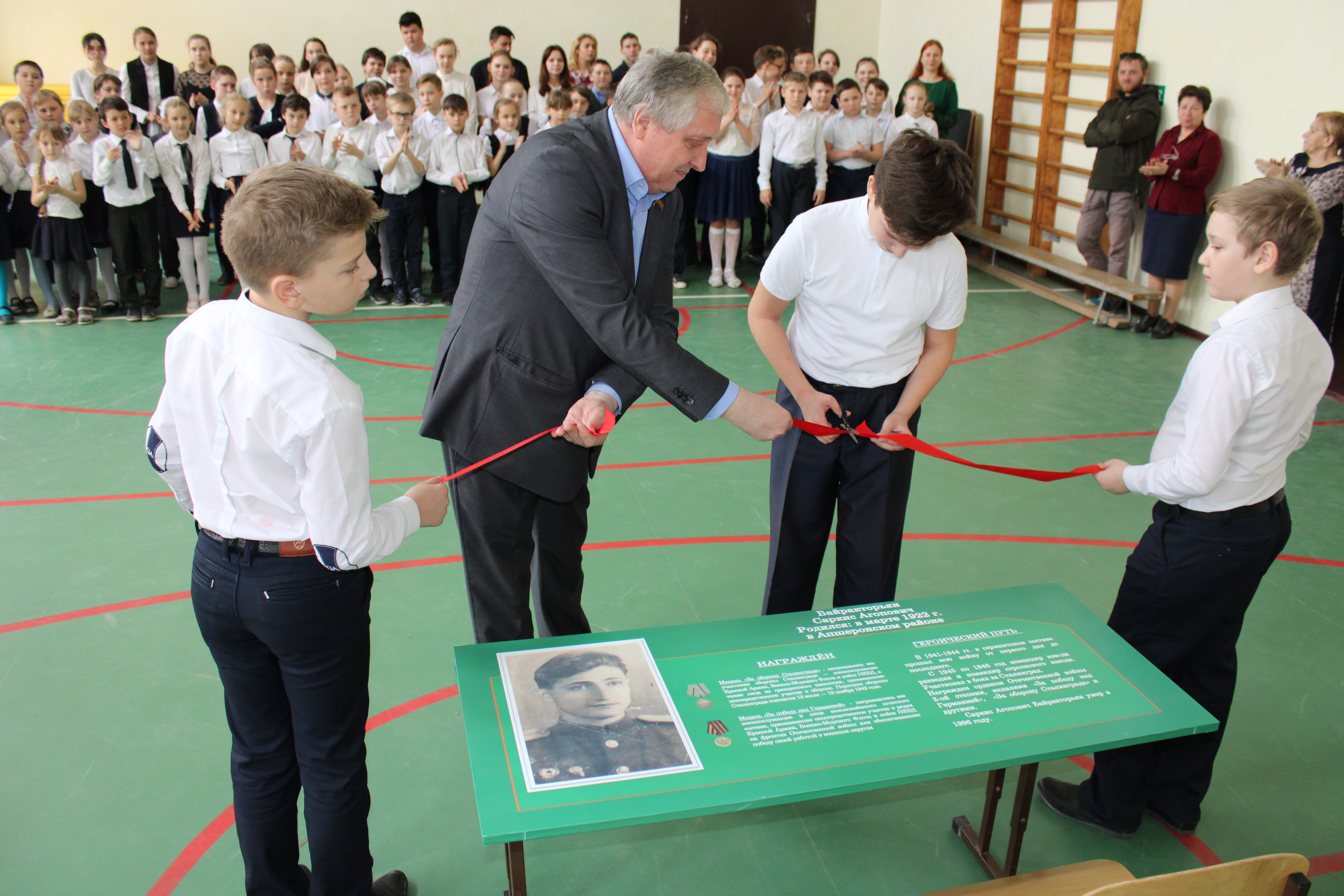 В школе № 32 Таманского сельского поселения состоялось торжественное открытие парты Героя, имени ветерана Великой Отечественной войны Саркиса Агоповича Байракторьяна.