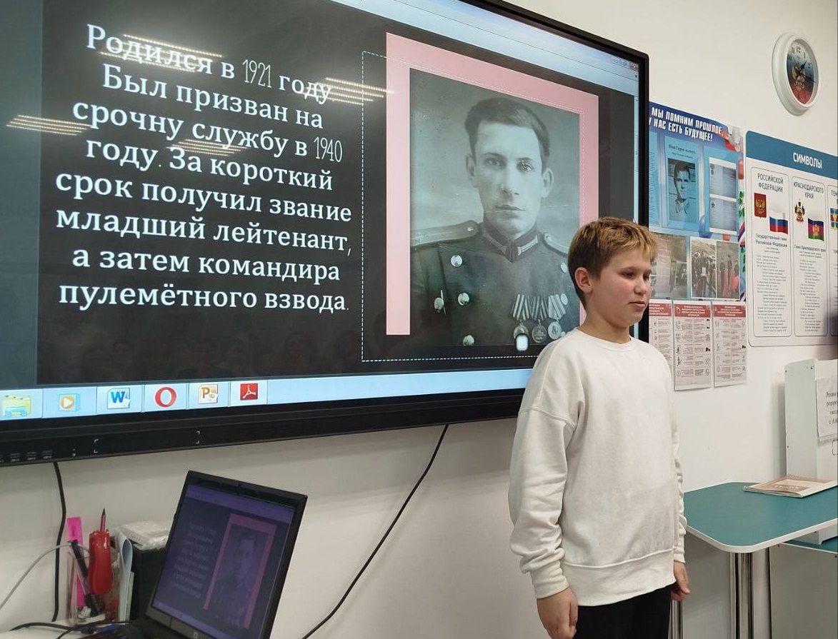 Память о войне… Её не сотрёшь с годами… Она вечна. Память – это преодоление времени. В этом величайшее нравственное её значение. Она нужна не только тем, кто выстоял, нужнее всего она нам, чтобы мы знали цену жизни, миру, дорожили каждым днем. На этом наша работа над проектом «Мой класс носит имя героя» не останавливается, мы будем продолжать знакомиться с историей войны и ее героями, - отметил молодой депутат, обратившись к школьникам.