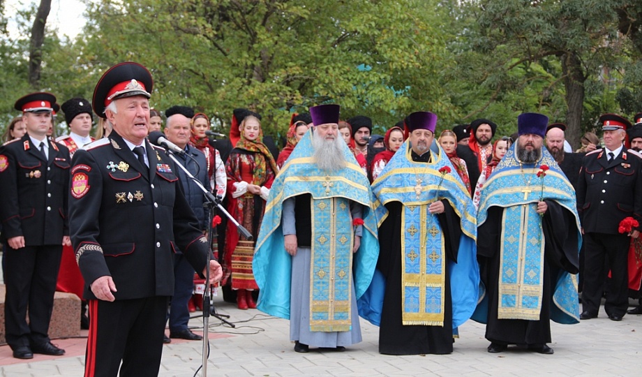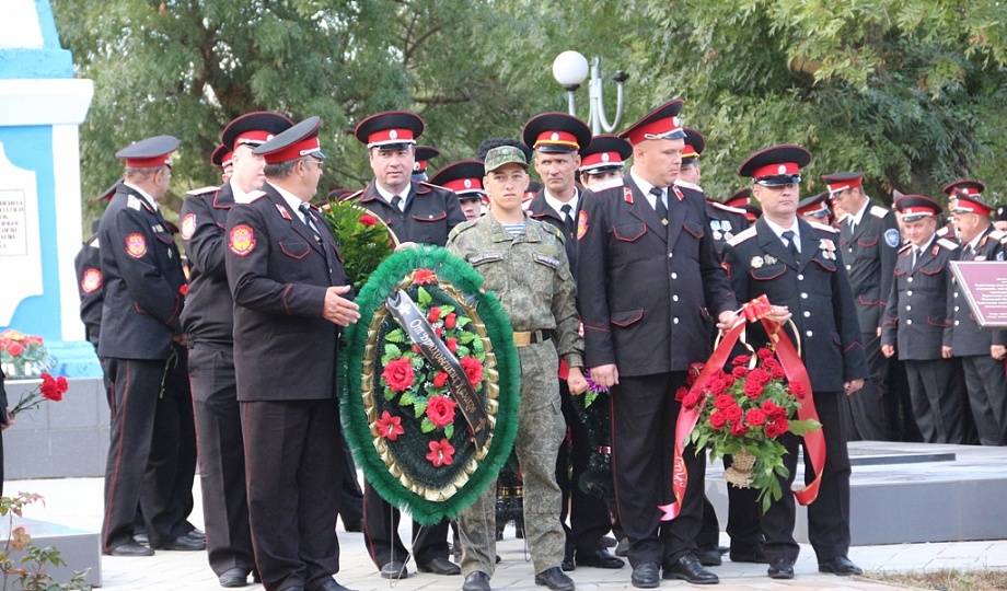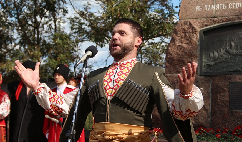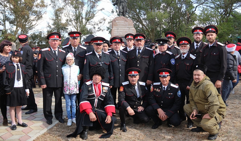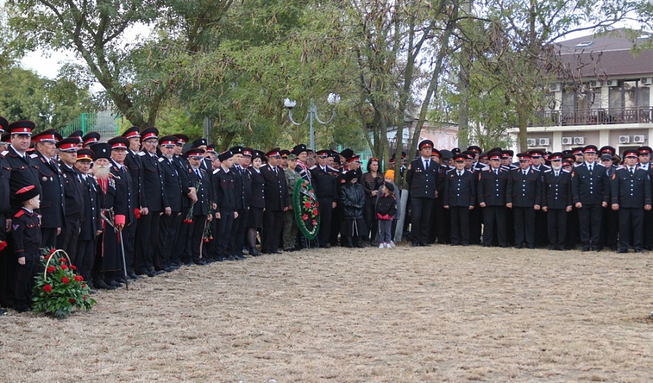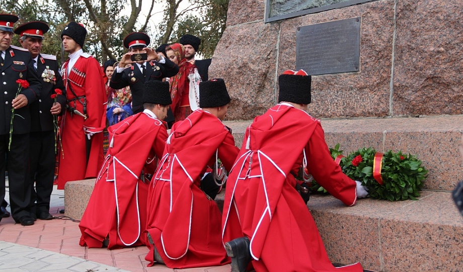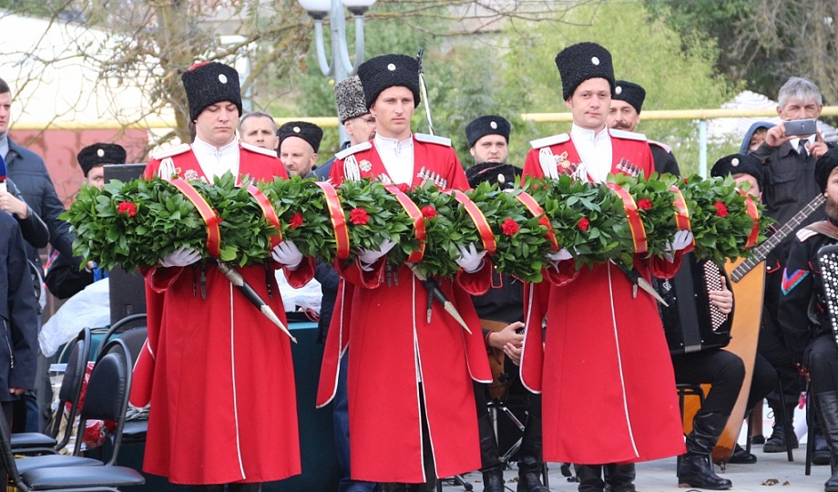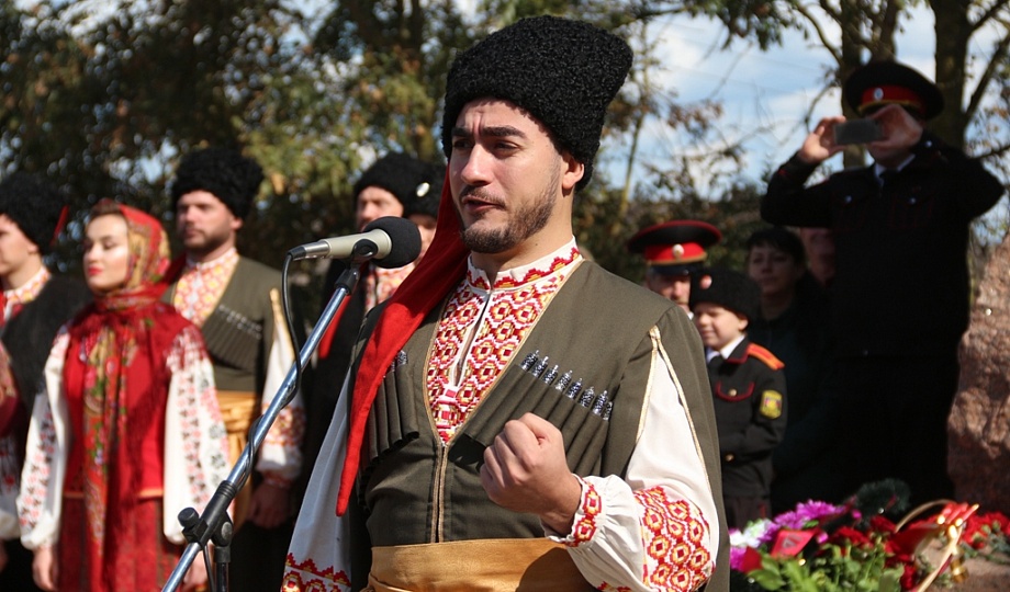 К памятнику казакам-переселенцам собравшиеся возложили гирлянду, венки и цветы. Для гостей праздника солисты Кубанского казачьего хора исполнили казачьи песни.