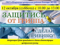 В субботу 12 октября 2019 года в здании администрации центрального рынка города Темрюка с 10:00 до 13:00 будет проводиться вакцинация против гриппа.