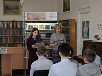 Десятилетия отделяют нас от событий Великой Отечественной войны. Но время не снижает интереса к этой теме, обращая внимание прежде всего современного поколения к далеким фронтовым годам, к истокам подвига и мужества нашего народа. Продолжая целенаправленную работу по гражданско-патриотическому воспитанию молодежи, 21 февраля специалисты межпоселенческой библиотеки для учащихся 7 «В» класса школы №1 провели мероприятие «Искусство тоже воевало».