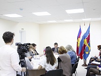Глава Темрюкского района Федор Бабенков провел пресс-конференцию, на которую были приглашены журналисты районных и краевых средств массовой информации, а также учащиеся школ района – юные корреспонденты.