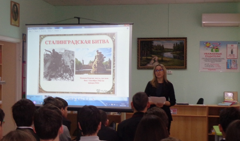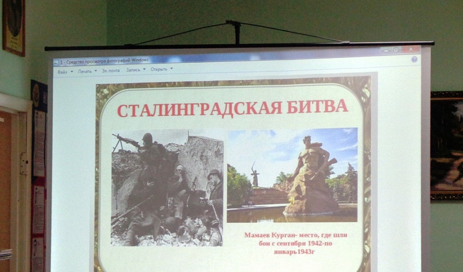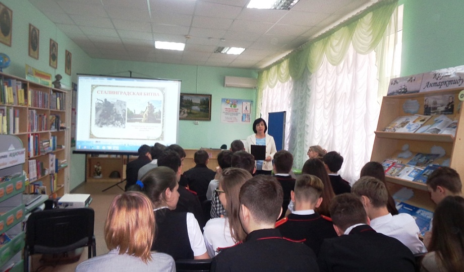 Библиотекарь детской библиотеки совместно с начальником архивного отдела администрации МО ТР Еленой Васильевной Падалицей провели беседу со школьниками, на которой рассказали, какой ценой досталась победа советской армии, сколько испытаний выпало на долю жителей и защитников города. Неизгладимое впечатление оставили в памяти ребят подвиги Михаила Паникахи, Якова Павлова, Матвея Путилова, и других защитников города. Ученики также узнали о Мамаевом кургане и его значении в битве за Сталинград. На мероприятии звучали стихи, посвященные городу-герою Сталинграду.