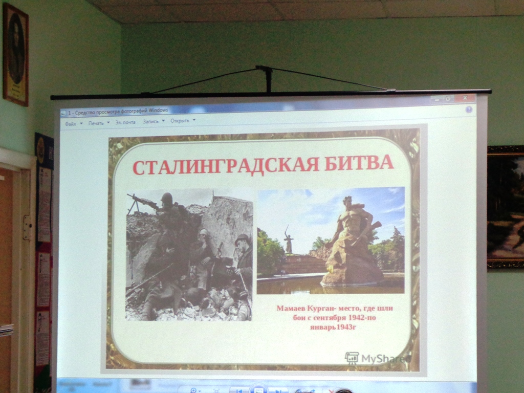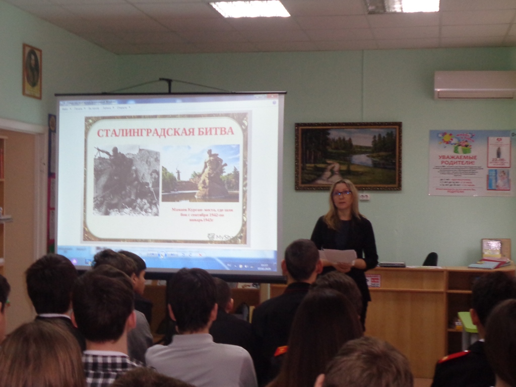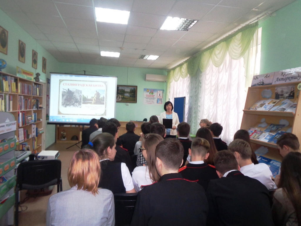 Библиотекарь детской библиотеки совместно с начальником архивного отдела администрации МО ТР Еленой Васильевной Падалицей провели беседу со школьниками, на которой рассказали, какой ценой досталась победа советской армии, сколько испытаний выпало на долю жителей и защитников города. Неизгладимое впечатление оставили в памяти ребят подвиги Михаила Паникахи, Якова Павлова, Матвея Путилова, и других защитников города. Ученики также узнали о Мамаевом кургане и его значении в битве за Сталинград. На мероприятии звучали стихи, посвященные городу-герою Сталинграду.