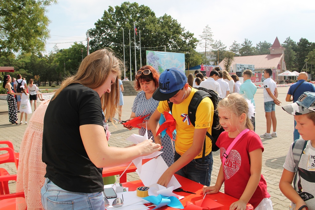 Участникам праздничного митинга волонтеры вручали ленточки-триколоры, флажки и наносили аквагрим в виде российского флага, здесь же, на площади, проводились мастер-классы по изготовлению поделок с символикой российского флага.
