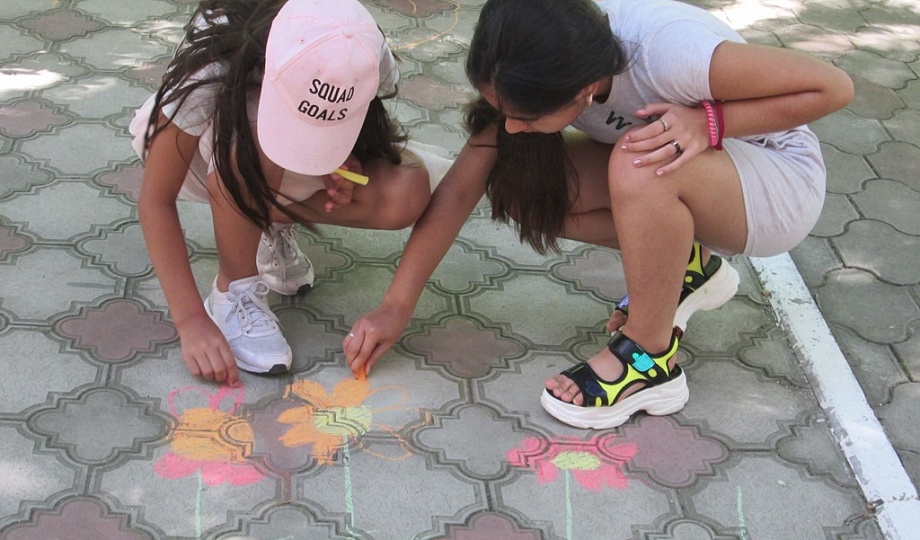 В завершение дети рисовали мелом на асфальте композиции, которые у них ассоциируются со счастьем и благополучием.