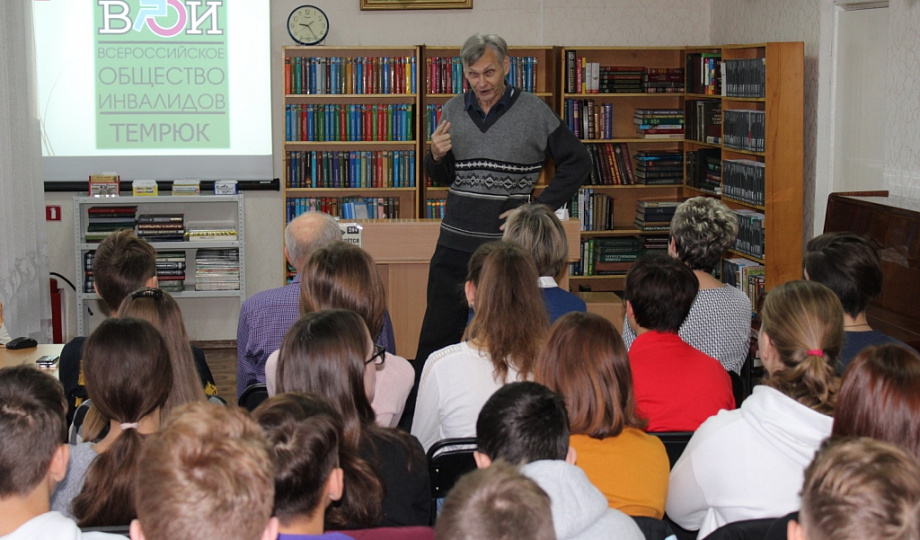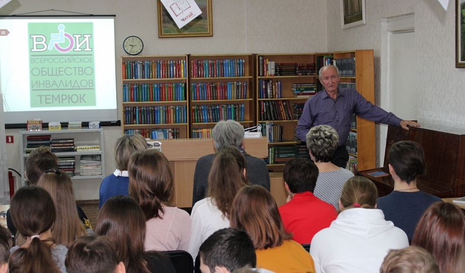 Такие люди, обладающие невероятной волей к жизни, верой в себя и свои возможности, есть и среди нас. В Темрюкском районе уже много лет существует районная организация Всероссийского общества инвалидов, деятельность которой направлена на поддержку, защиту и адаптацию людей с ограничениями по здоровью. О насыщенной культурной, познавательной, спортивной жизни членов общества рассказали школьникам исполняющий обязанности председателя правления Темрюкского районного общества инвалидов Юрий Самохвалов и член правления, а также постоянный читатель библиотеки, Станислав Бурдеев.